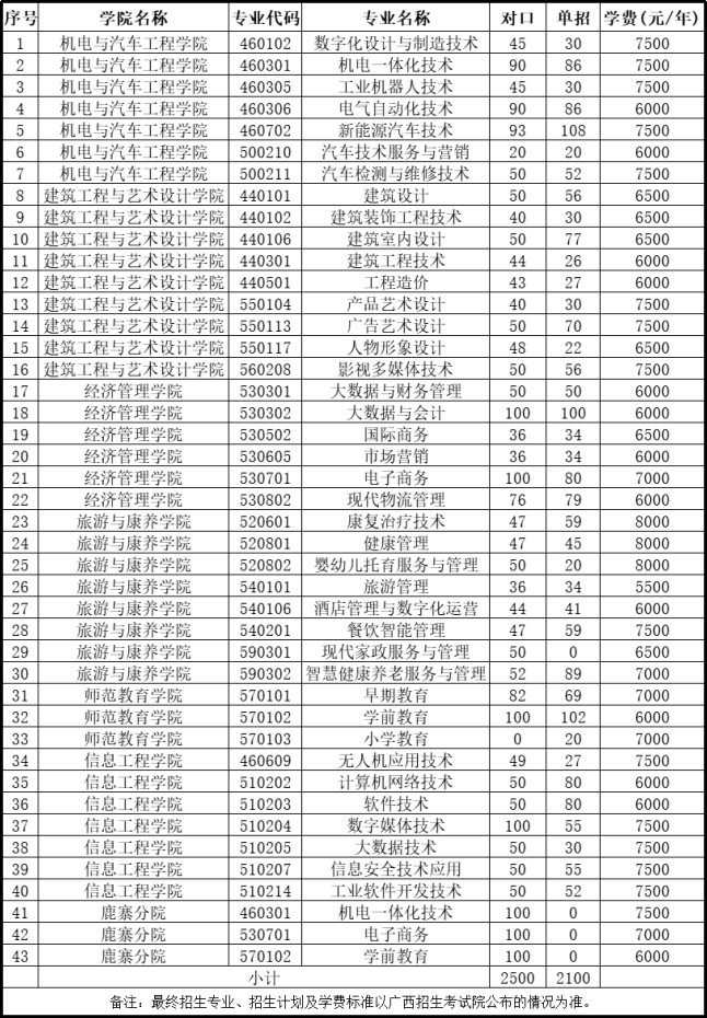 柳州城市职业学院2025年单独招生、对口中职自主招生专业计划表