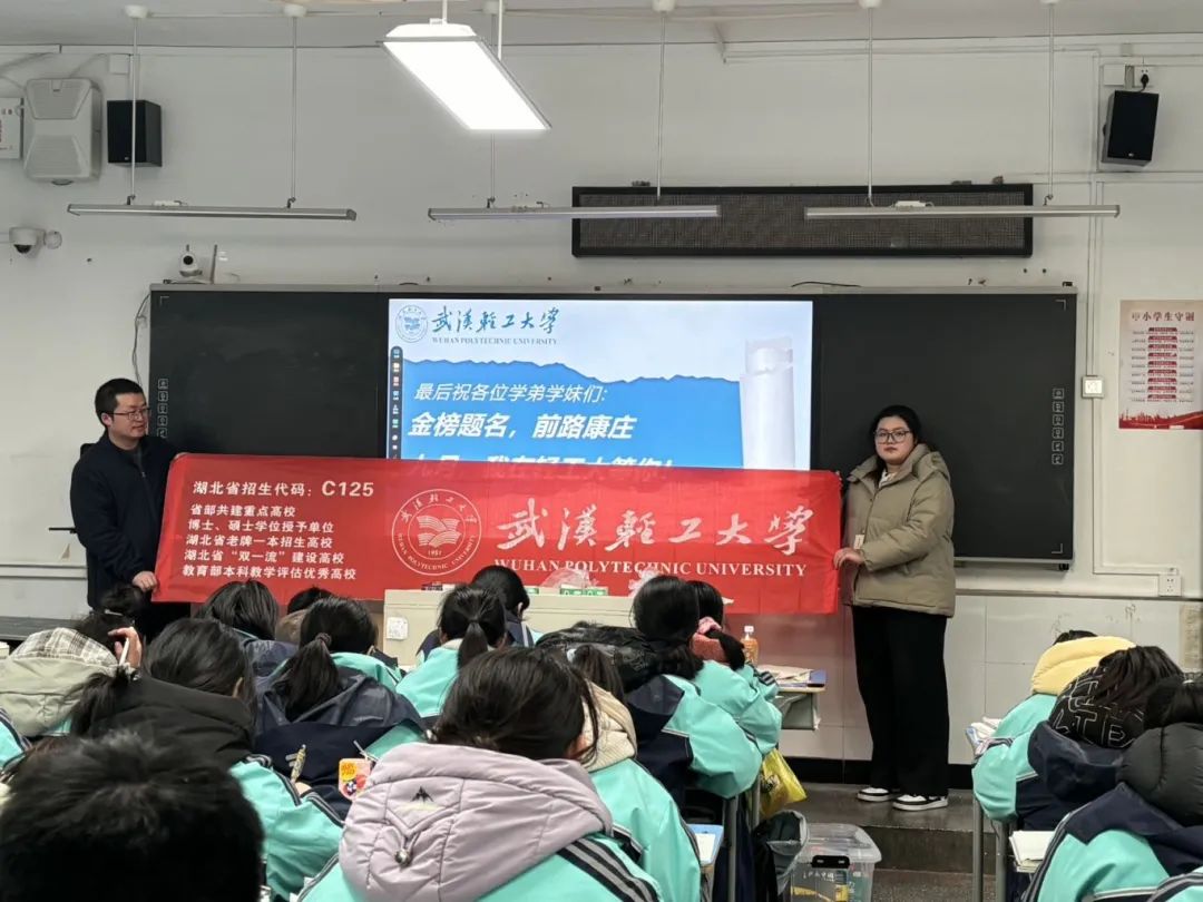 罗田县第一中学食品科学与工程学院的方珍和动物科学与营养工程学院的程玺霖在罗田县第一中学开展招生宣传活动。