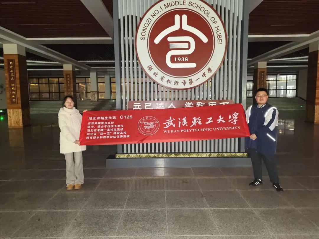松滋市第一中学机械工程学院的刘奕杰、彭佳宇和外国语学院的赵郑媛在松滋市第一中学开展招生宣传活动。