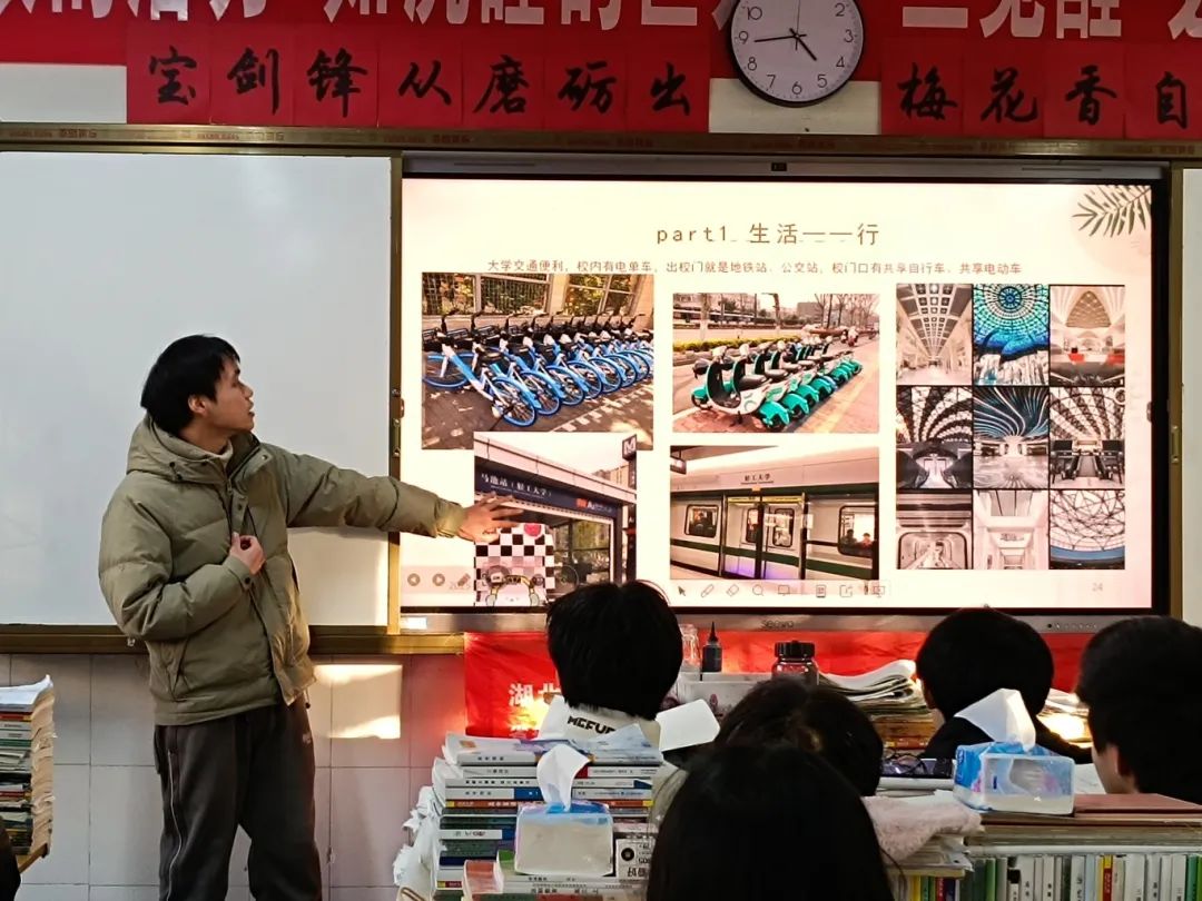 实践内容及感悟1月15号下午,我满怀激动与感恩,重返高中母校武汉市新洲区第四中学,开展招生宣传活动。此次活动旨在分享大学经历、传递招生资讯,助力学弟学妹们更好规划未来,在母校师生大力支持下,下午宣传效果超乎预期。