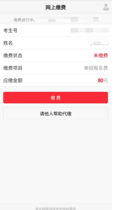 网上缴费提供两种方式,一种方式是使用自己的微信号进行支付,另一种方式可请他人帮助代缴。