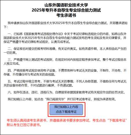 3.考生须认真阅读考生承诺书,并履行承诺书要求,“点击下载准考证”默认考生已签订考生承诺书。