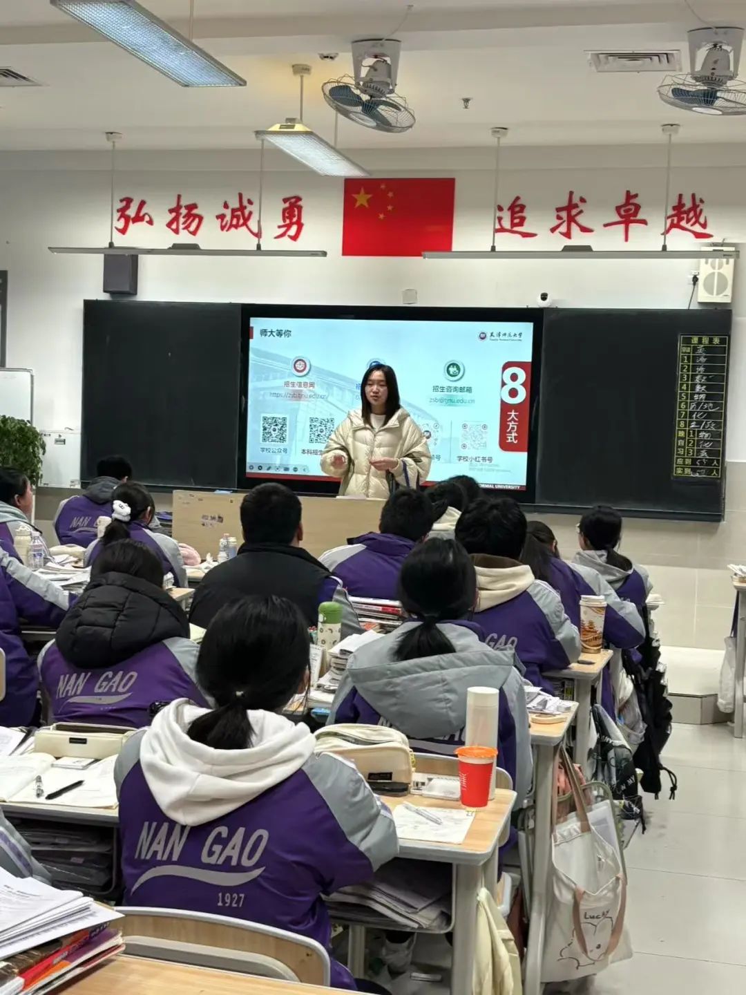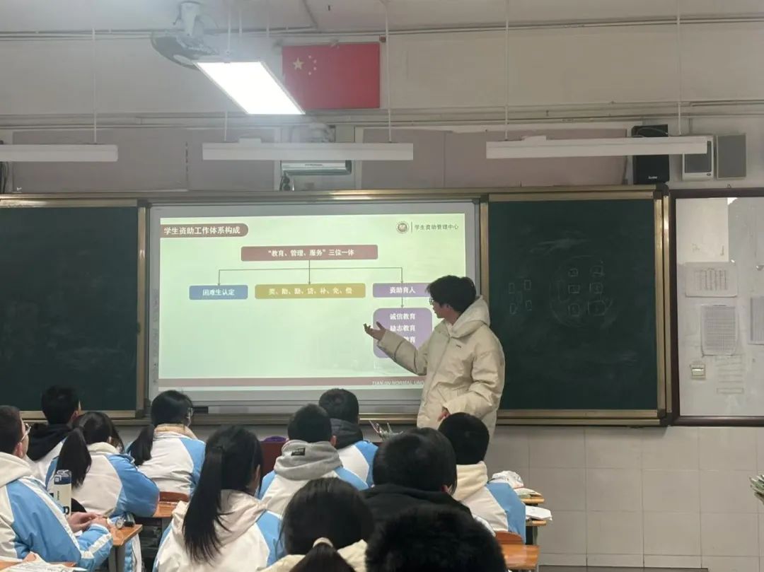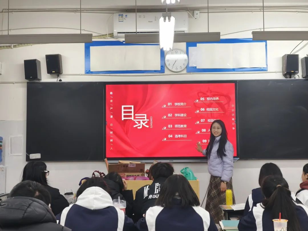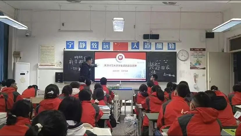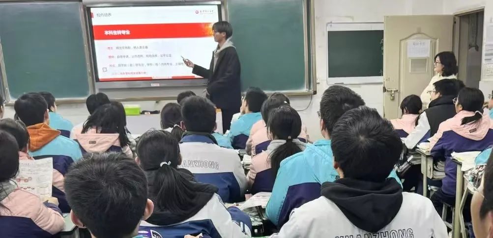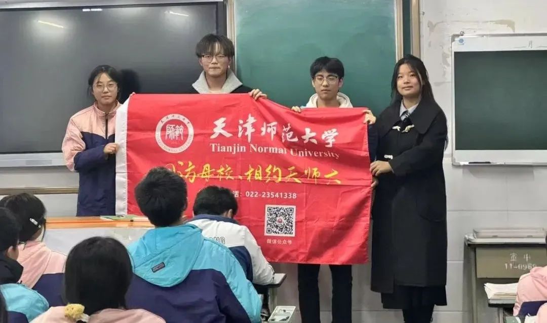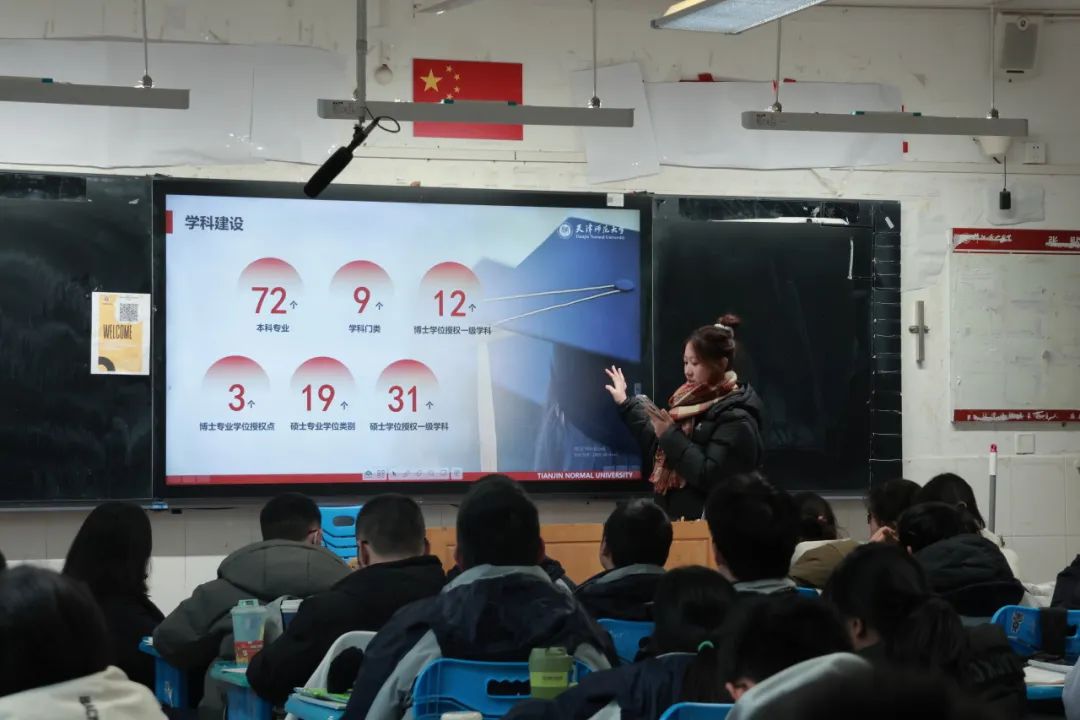 踏入熟悉的教室,与恩师相拥的瞬间,过往的青春记忆与此刻的使命感在心头交织,此次回访母校宣讲经历令我们感慨万千。面对台下身着校服的学弟学妹,我们结合自身学习生活详细讲解天津师范大学的宣传PPT,同时展开互动问答环节,还发放了天师大定制的宣传册、文创书签等资料,现场气氛热烈,生动展现了天师大的活力与底蕴。