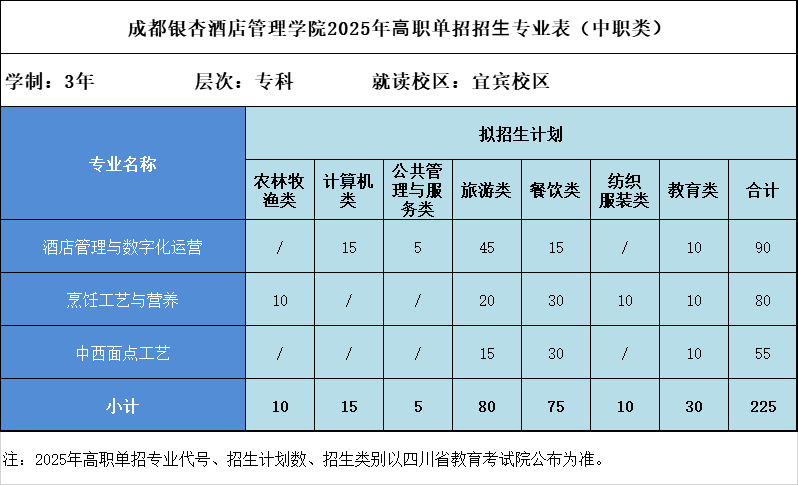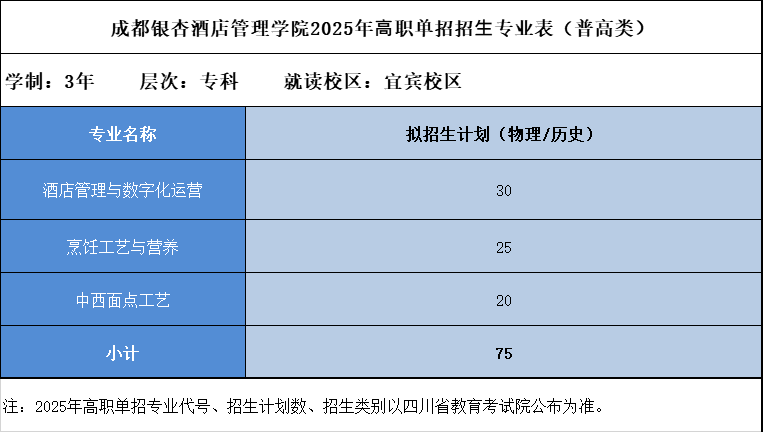 ​成都银杏酒店管理学院2025年高职单招专业计划表