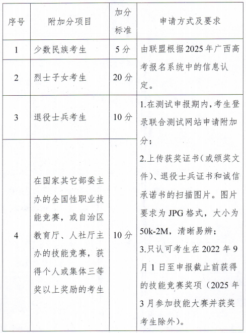 经联盟院校统一评审认定免试资格及附加分,于2025年3月18-29日在广西高职高专招生网站(https://www.gxzslm.cn/)公示。