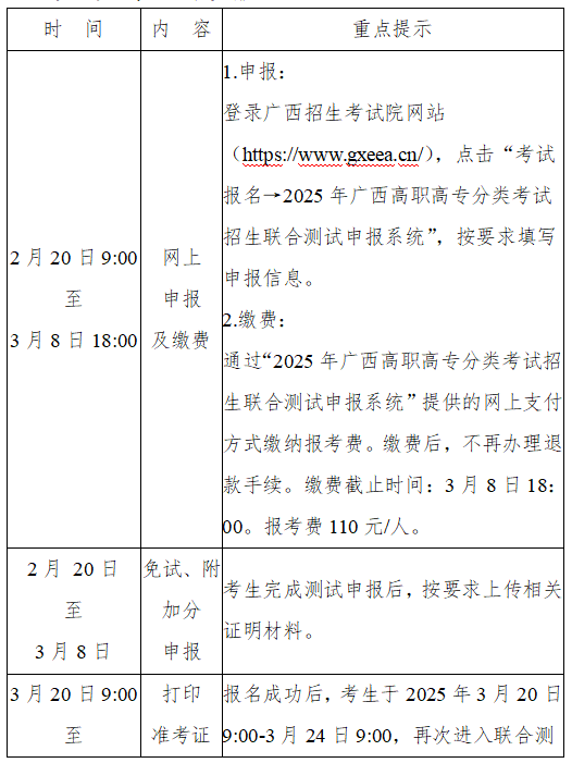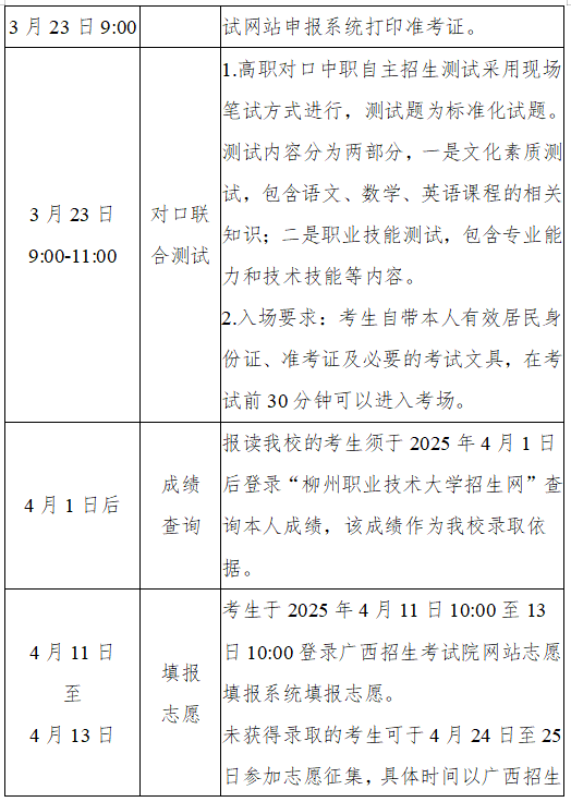 已参加“广西高职高专招生联盟”统一测试并取得相应测试成绩的考生,须于2025年4月11日10:00至13日10:00登录“广西招生考试院”网站,志愿填报系统填报相应类别的志愿,没有填报志愿的考生视为放弃当年高职对口中职自主招生录取资格。根据招生计划完成情况设置征集志愿,未获得录取的考生可于2025年4月24日10:00至25日10:00再次登录“广西招生考试院”网站志愿填报系统填报征集志愿。
