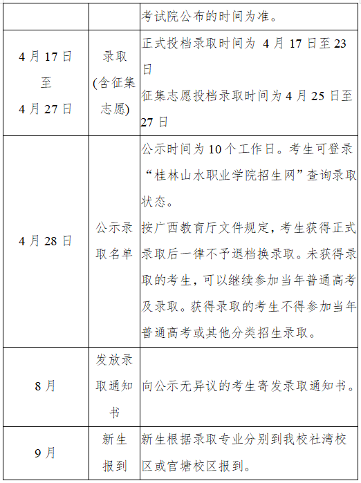 录取名单经广西招生考试院录检通过后,于2025年4月28日前,在“桂林山水职业学院招生网”进行公示,公示期为10个工作日,公示的信息保留至年底。