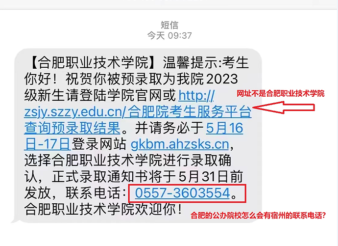 【诈骗形式】:冒充合肥职业技术学院发布不实短信