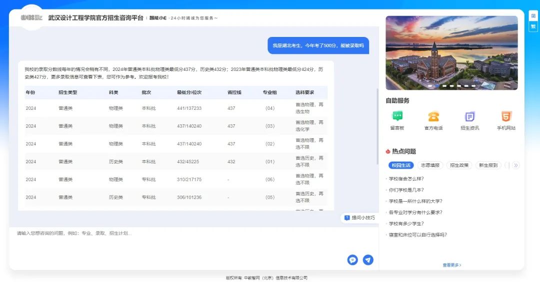 当你问“我是湖北考生,今年考了500分,能被录取吗?”时,系统不仅能通过DeepSeek大模型技术精准识别你的咨询意图是:省份、分数、选科要求、录取分数,还会结合历年录取数据,为你提供精准的回复!