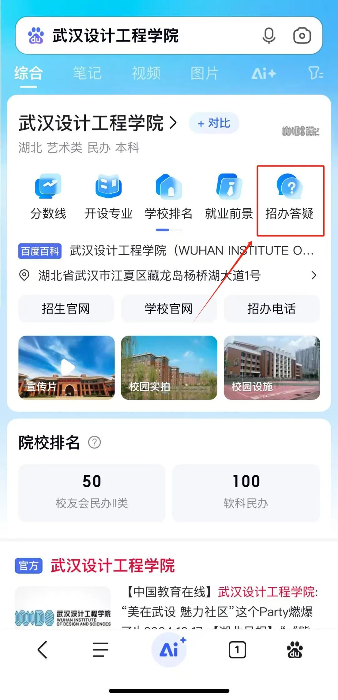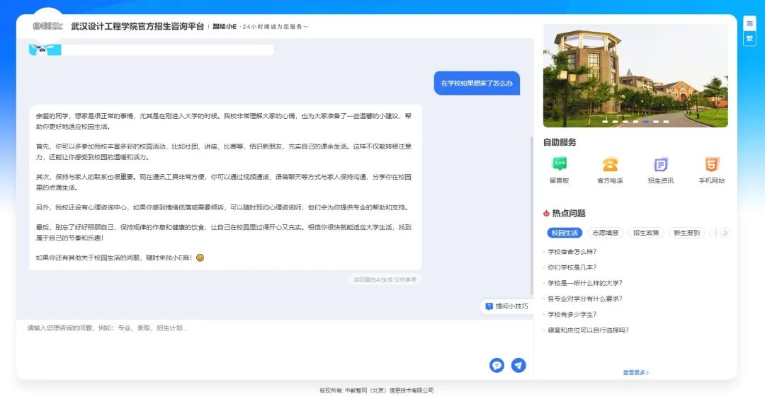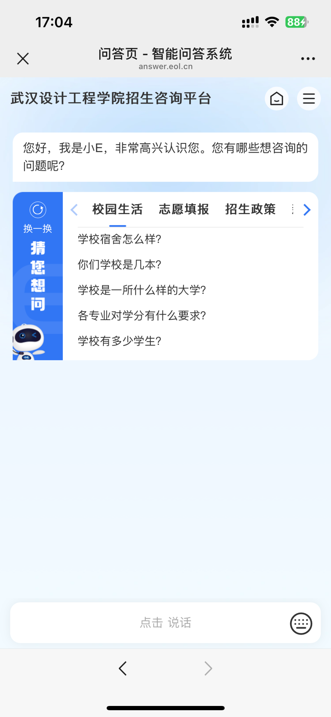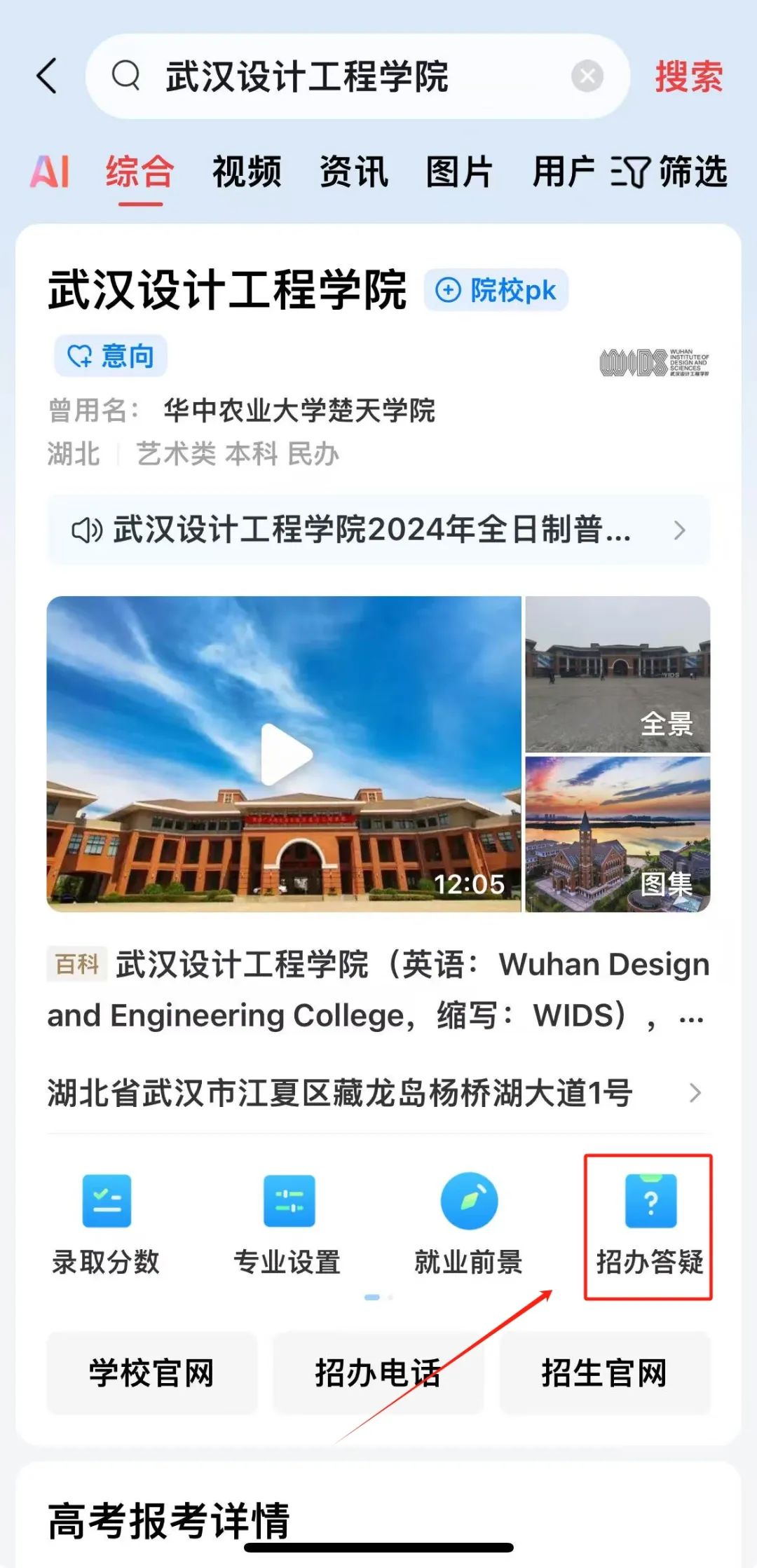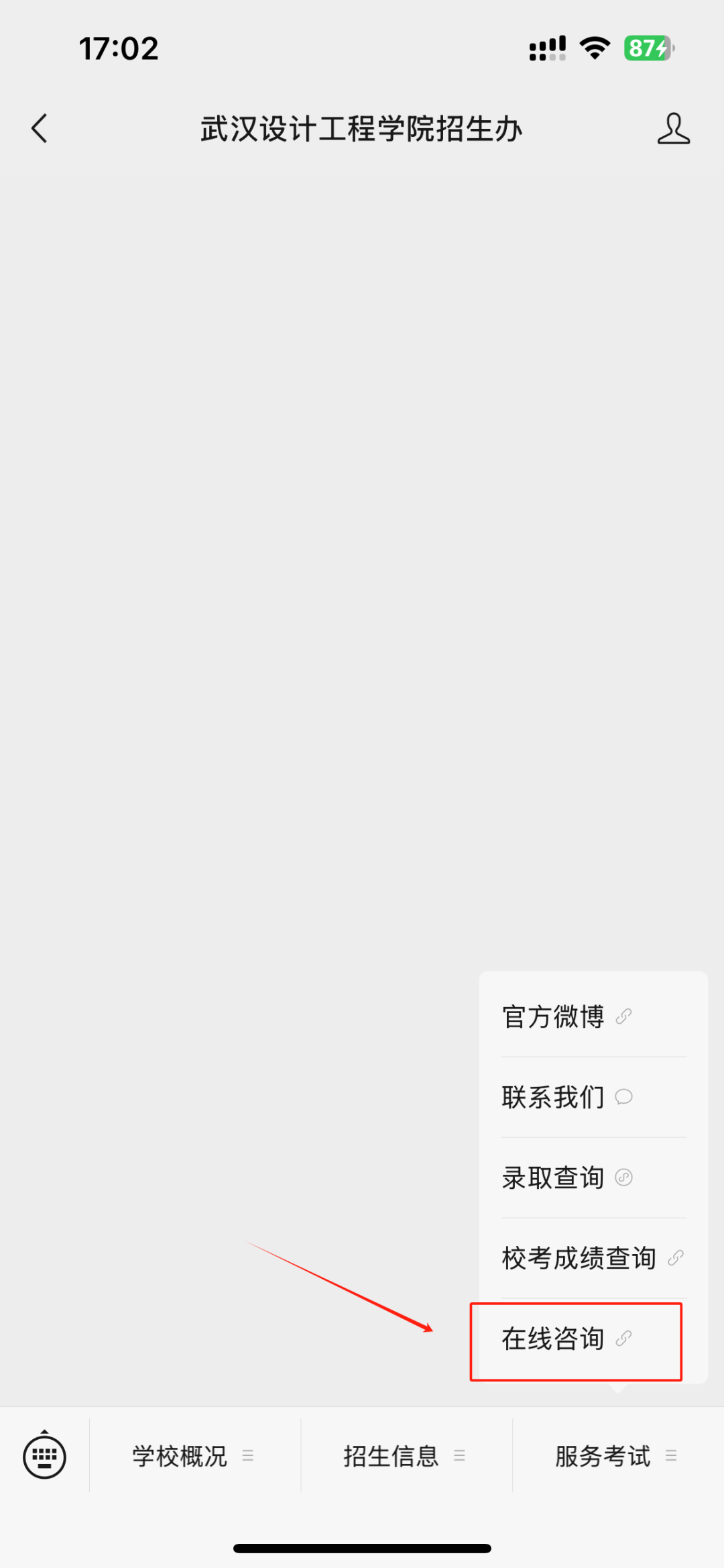 关注后可进入到“武汉设计工程学院招生办”微信公众号主页,点击底栏菜单栏“服务考试”的“在线咨询”即可在线咨询。移动端招生咨询平台问答页同时支持语音提问。