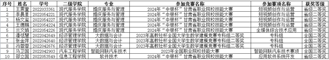 按照甘肃省教育厅《关于印发〈2025年甘肃省普通高等学校高职 (专科)升本科考试招生工作方案〉的通知》(甘教发[2024] 3号)和甘肃省高等学校招生委员会《关于印发〈2025年甘肃省普通高校高职(专科)升本科免试招生工作实施方案〉的通知》(甘招委发[2025] 1号)相关文件要求,现对符合专升本免试入学报名资格的10名竞赛获奖学生予以补充公示。