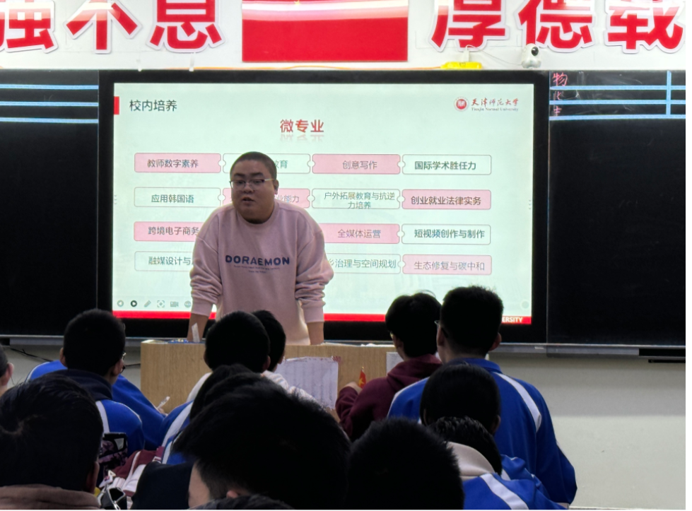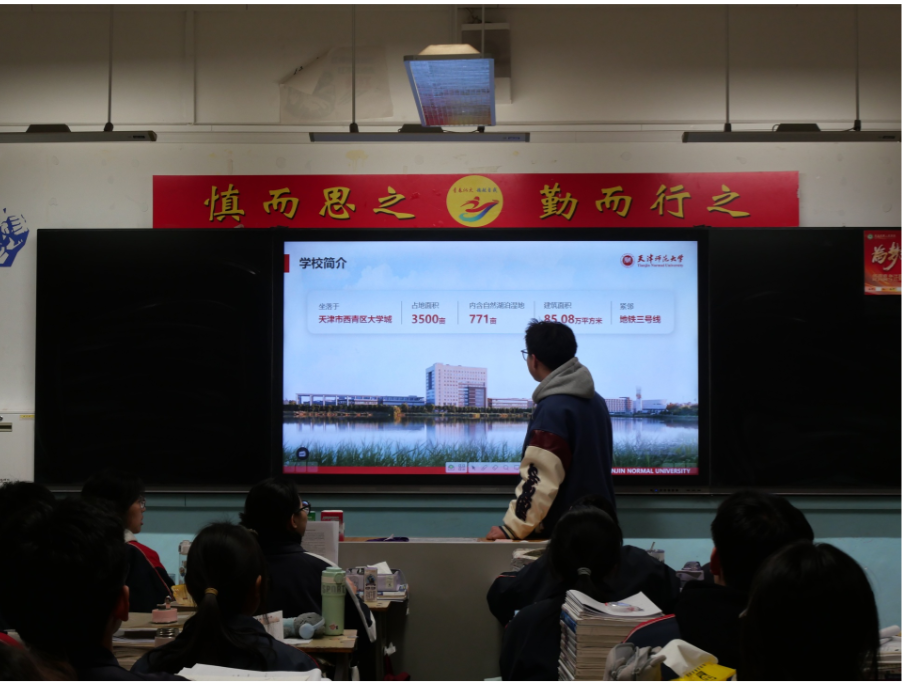 在本次回母校宣传活动中,我们以主题宣讲会形式,带着天津师范大学的温暖重返母校。通过精心制作的 PPT,展示校园风光、教学设施与师资力量,分享大学生活点滴,让学弟学妹们对大学生活充满期待。