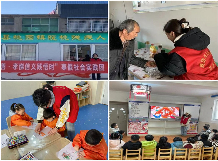 商贸与人文学院“崇德尚善・孝悌信义践悟时”寒假社会实践团第一站到达了睢宁县桃园镇暖桃残疾人之家,为老人们带去了精心准备的礼物,还为老人打扫卫生,扫地、擦桌子、拖地等;实践团在家乡社区开展“悌行邻里”儿童关爱活动,现场教孩子们包饺子、绘画、做手工,在他们心中种下了“悌”的种子;走入商业街区,开展 “诚信经营,从我做起”的宣传活动;队员们还前往当地乡村地区的幼儿园进行支教,开展关于过年的手工活动和新年课程,帮助幼儿拓宽视野、增长知识。