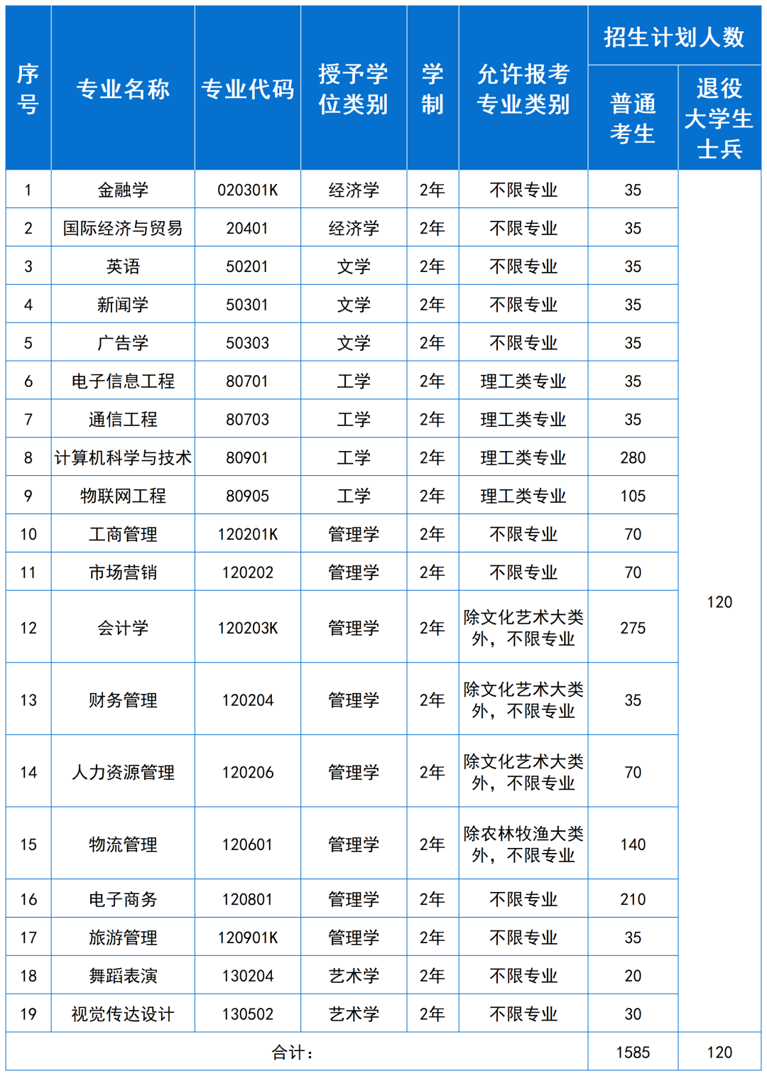 我校专升本招生计划分“普通考生计划”“退役大学生士兵计划”2类。招生专业与分专业计划如下。