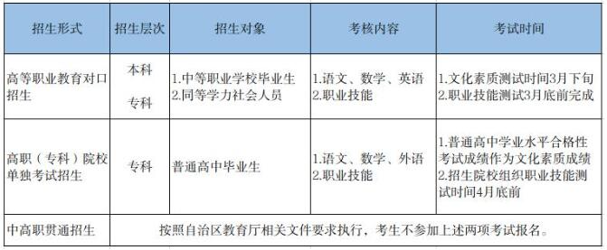 2020年至2022年,自治区分别印发《自治区教育厅关于印发〈宁夏回族自治区高等职业教育分类招生考试改革实施方案(修订)》的通知》《自治区人民政府关于印发宁夏回族自治区深化普通高等学校考试招生综合改革实施方案的通知》,明确高职对口招生面向中等职业学校毕业生招生,高职单招面向普通高中毕业生招生。 高职对口招生与高职单招均采用“文化素质+职业技能”的评价方式,分别为中职学校毕业生和普通高中毕业生提供了不同的升学通道,遵循了教育规律,适应了人才多样化特点,是对现行考试招生制度的优化和完善:
