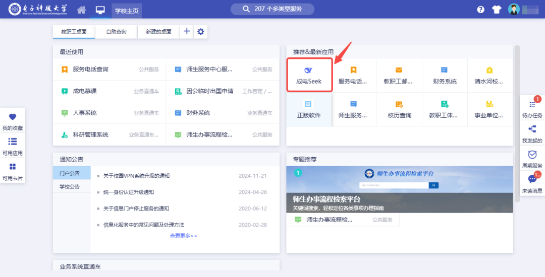 登录“网上服务大厅”,找到“推荐&最新应用”,选择“成电Seek”