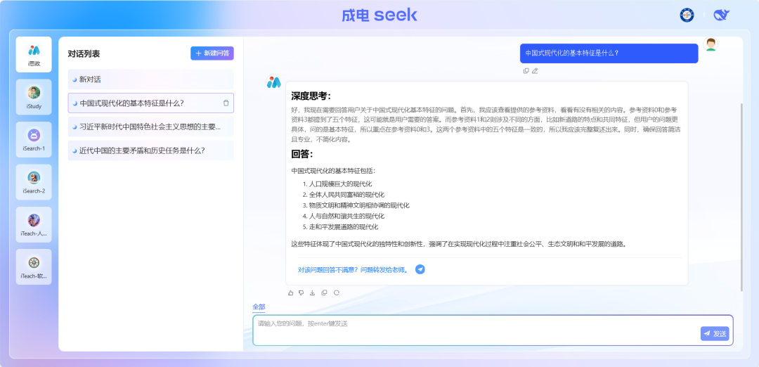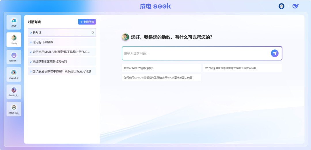 “成电Seek”是由电子科技大学、四川省人工智能学院、华为技术有限公司(成都)和成都索贝数码科技股份有限公司深度合作,依托学校高性能计算中心打造。目前还在基于昇腾910b搭建全栈国产化大模型平台,即将为全校师生提供更强算力,推动更多AI自主创新与应用落地,为全校师生带来智能化教学与科研的全新体验!