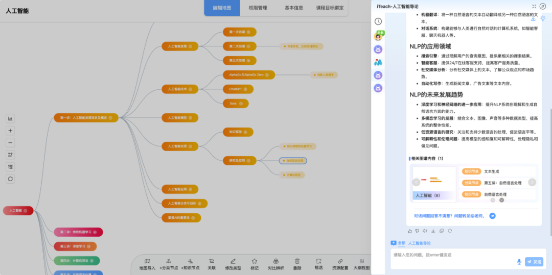 课程知识库支持课程课件、常态化录播课程、电子教材、教学大纲、论文、报告以及实验等资源,形成知识图谱打造案例式教学模式,为学生提供直观、深入的人工智能知识点解答。人工智能导论、软件工程等课程已经开放使用,后续将接入更多课程。
