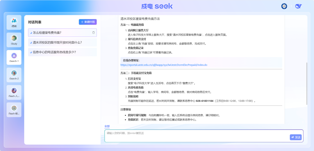 已完成师生办事流程检索平台的知识库对接,全校师生只需问问它,就能搞定事务办理、查规章、找信息!校园生活高效又便捷,“iSearch”都能帮你!