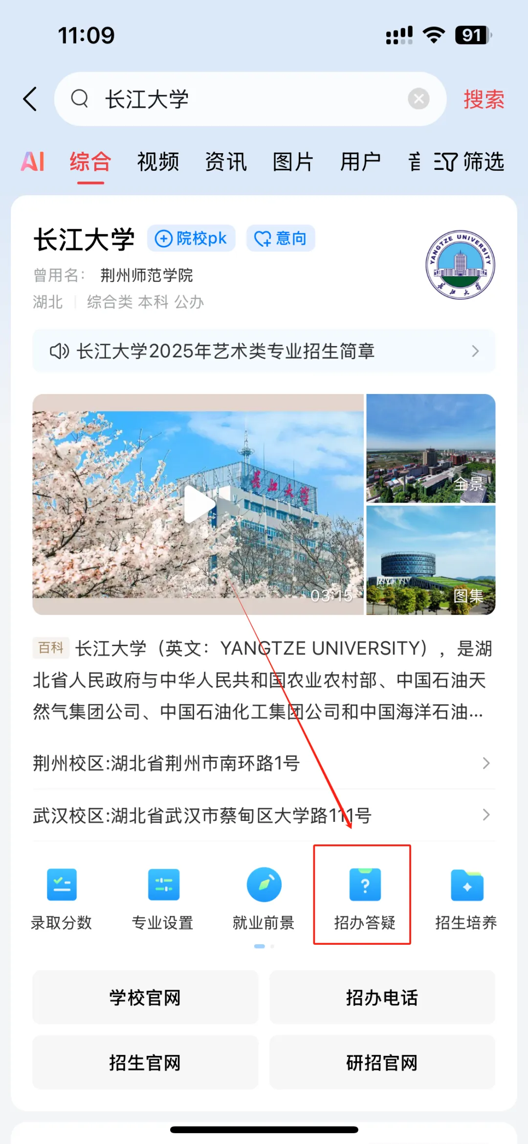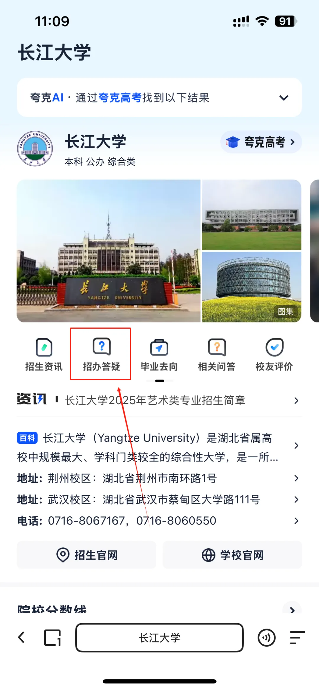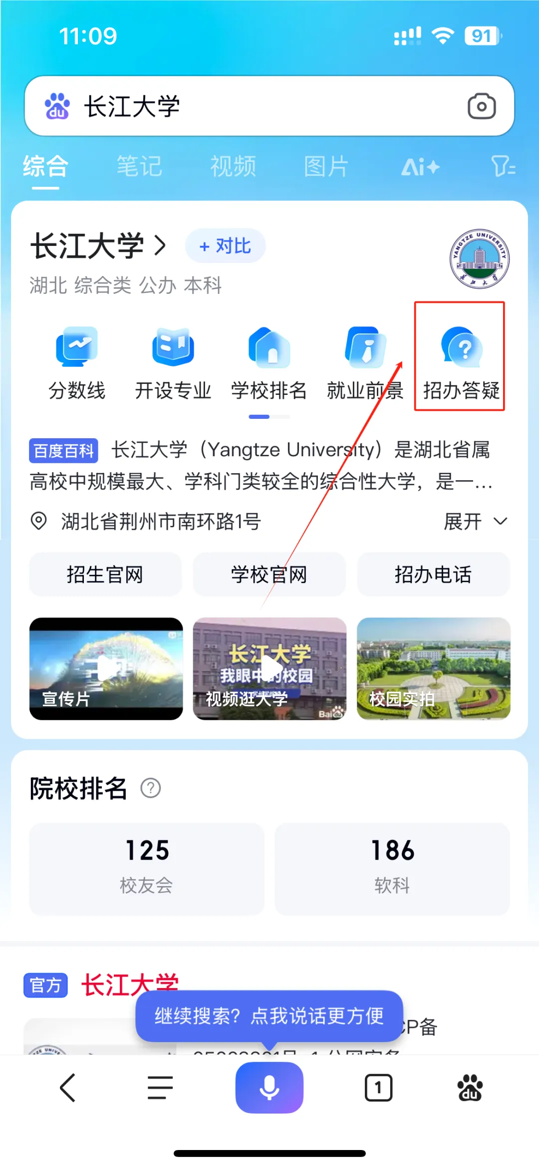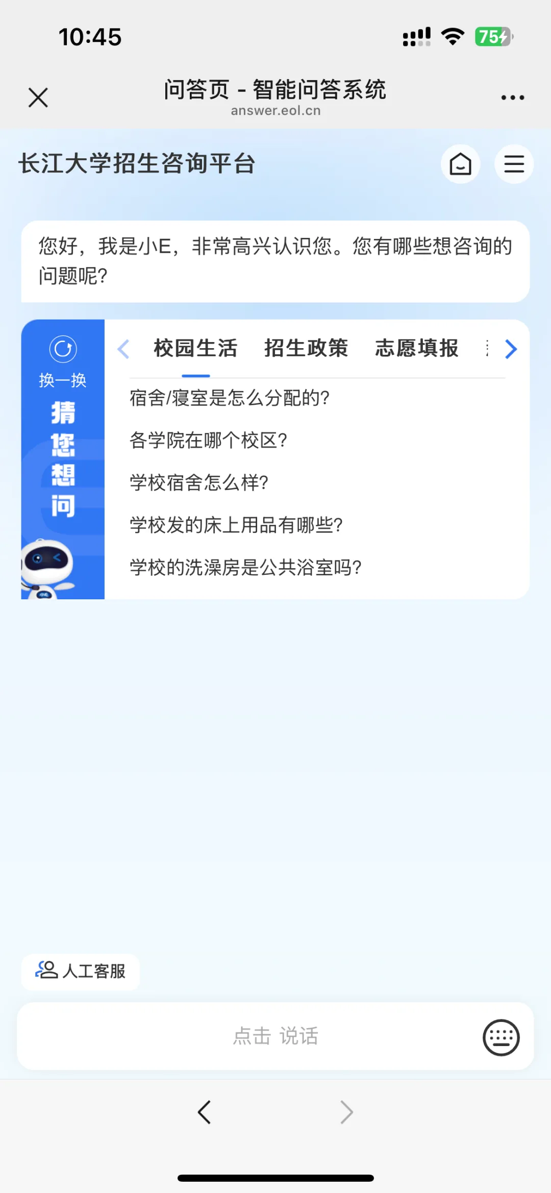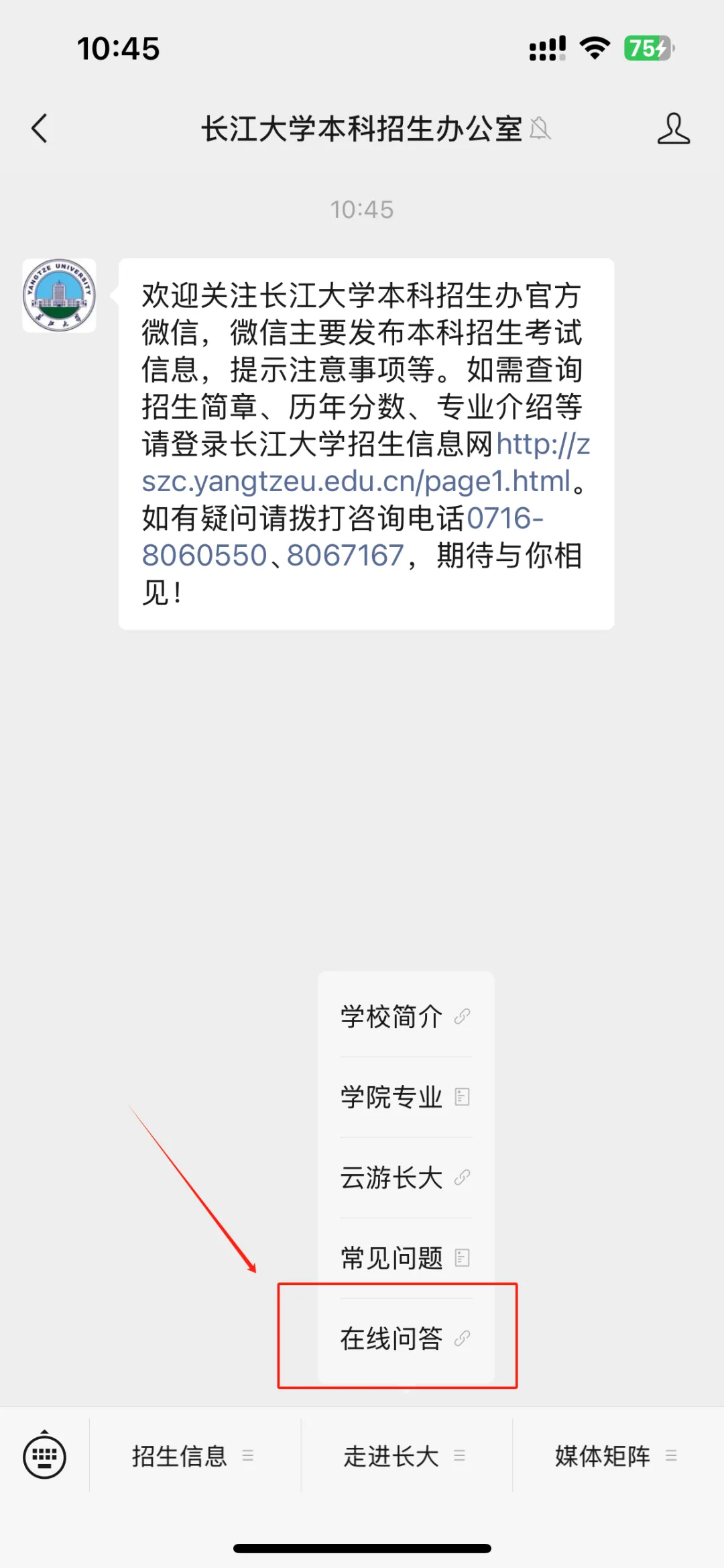 关注后可进入到“长江大学本科招生办公室”微信公众号主页,点击底栏菜单栏“走近长大”的“在线问答”即可在线咨询。移动端招生咨询平台问答页同时支持语音提问。
