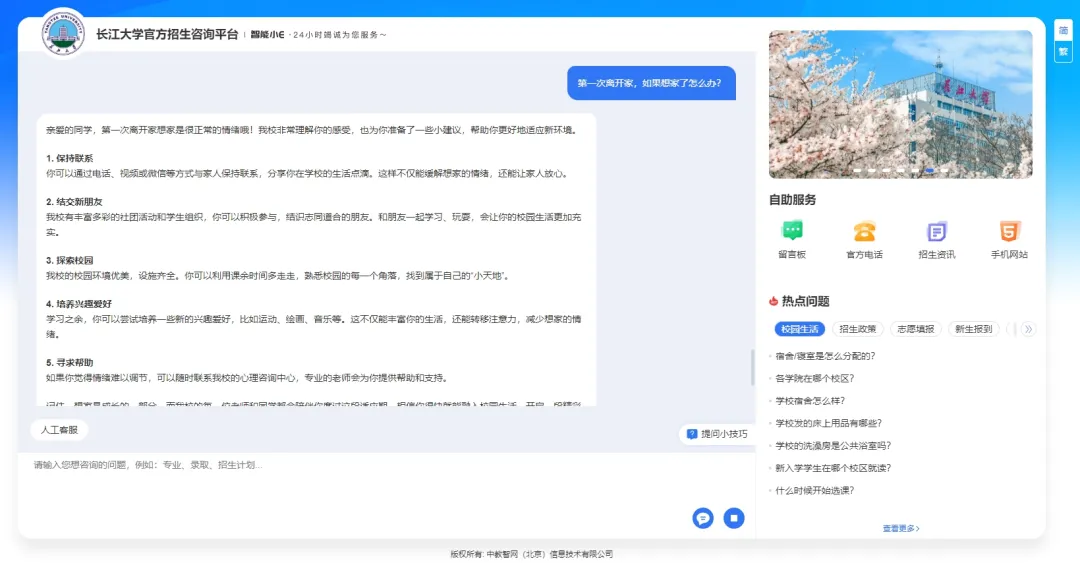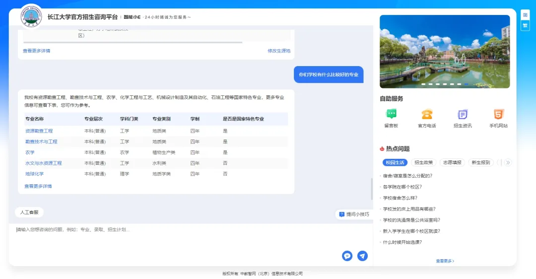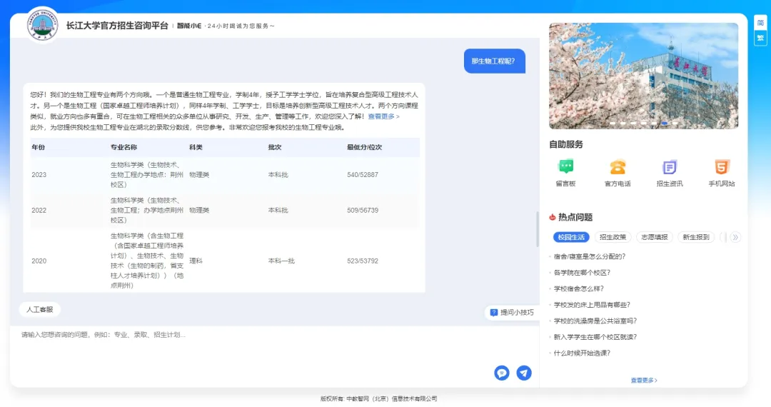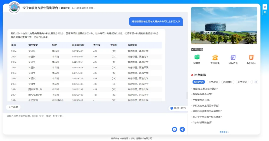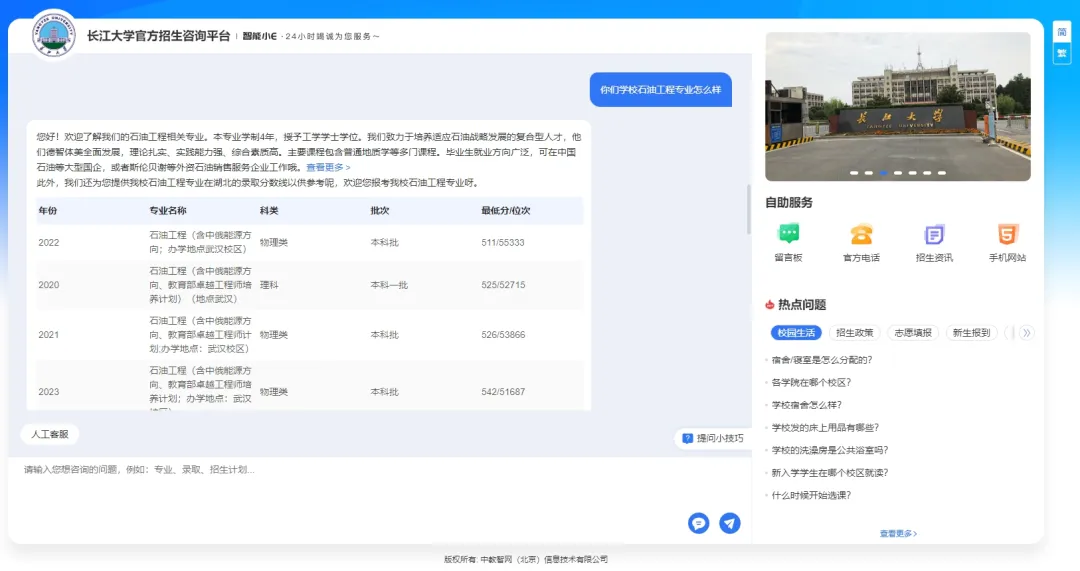 当你问“湖北物理类考生高考大概多少分可以上长江大学?”时,系统不仅能通过DeepSeek大模型技术精准识别你的咨询意图是:省份、分数、选科要求、录取分数,还会结合历年录取数据,为你提供精准的回复!