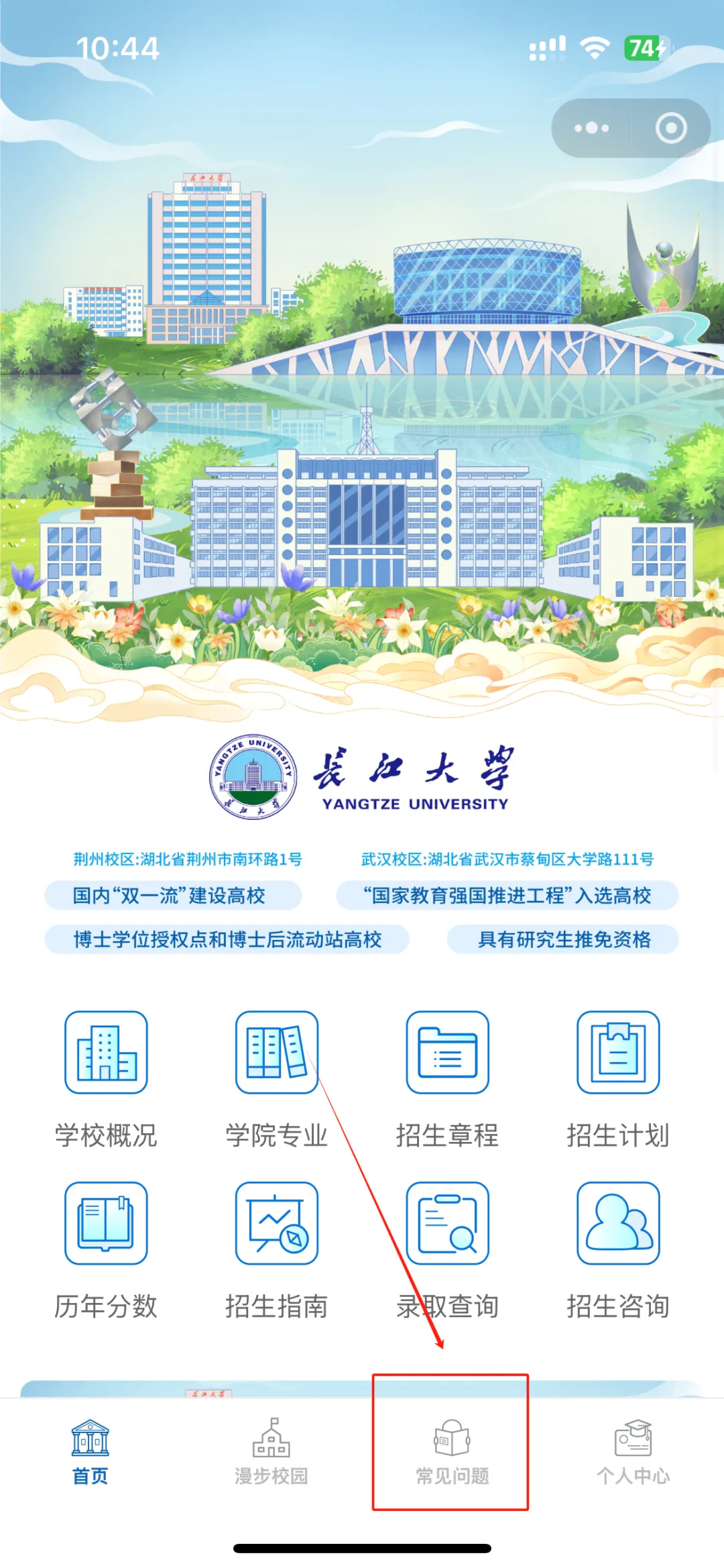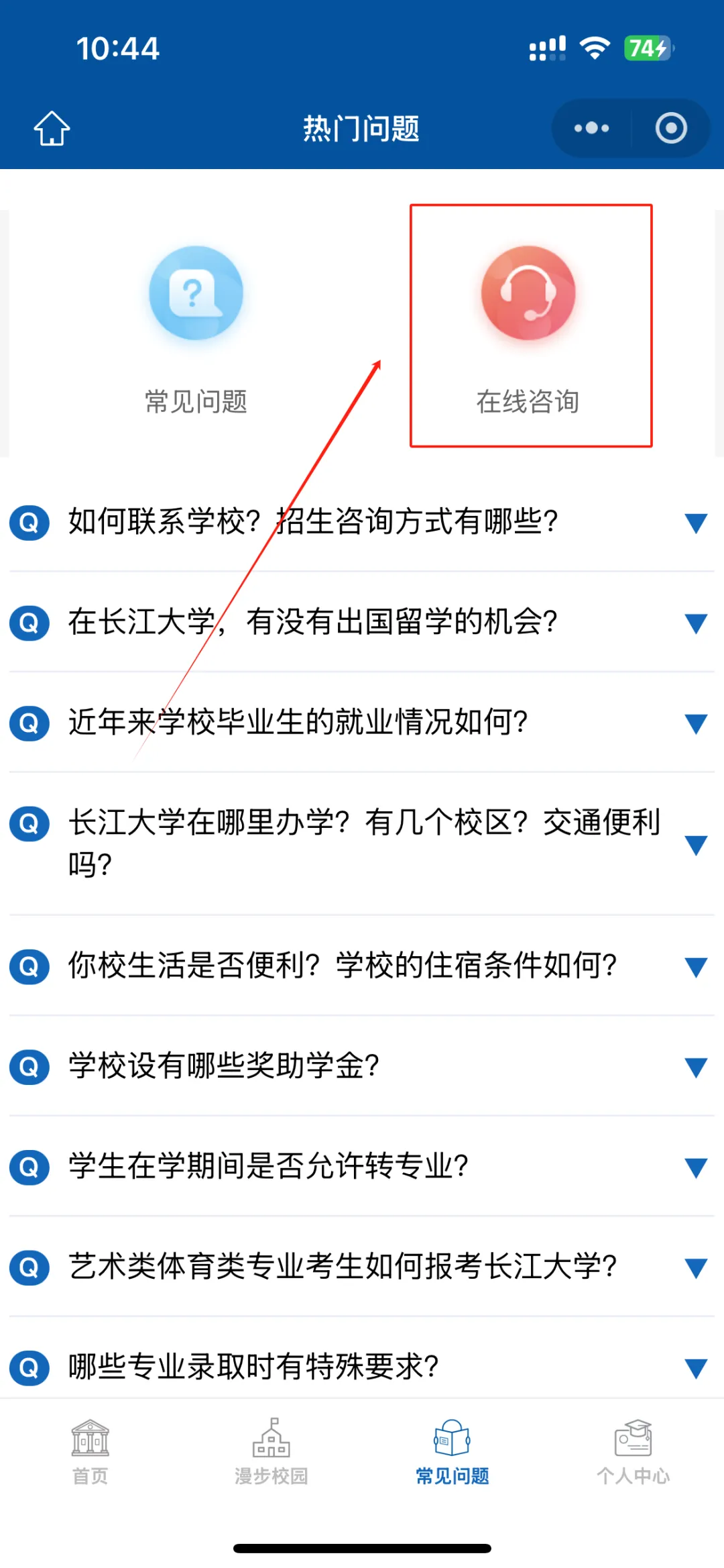 进入“长江大学本科招生”小程序主页面,点击“常见问题”后进入“在线咨询”,跳转至问答页即可进行提问。
