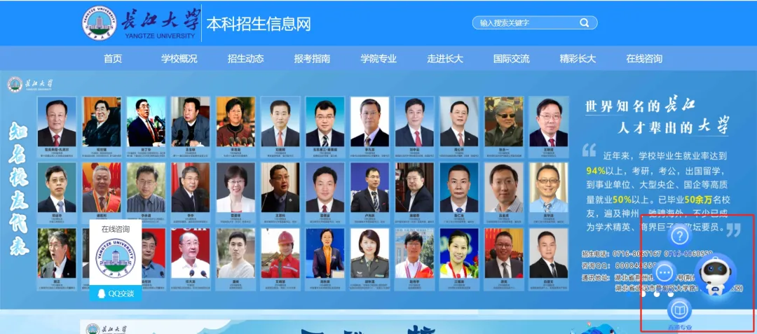 登录长江大学招生官网(网址:http://zszc.yangtzeu.edu.cn/),点击右侧“智能机器人小E”,在登录界面完善基础信息后即可在线咨询或留言。(操作详情见下图)