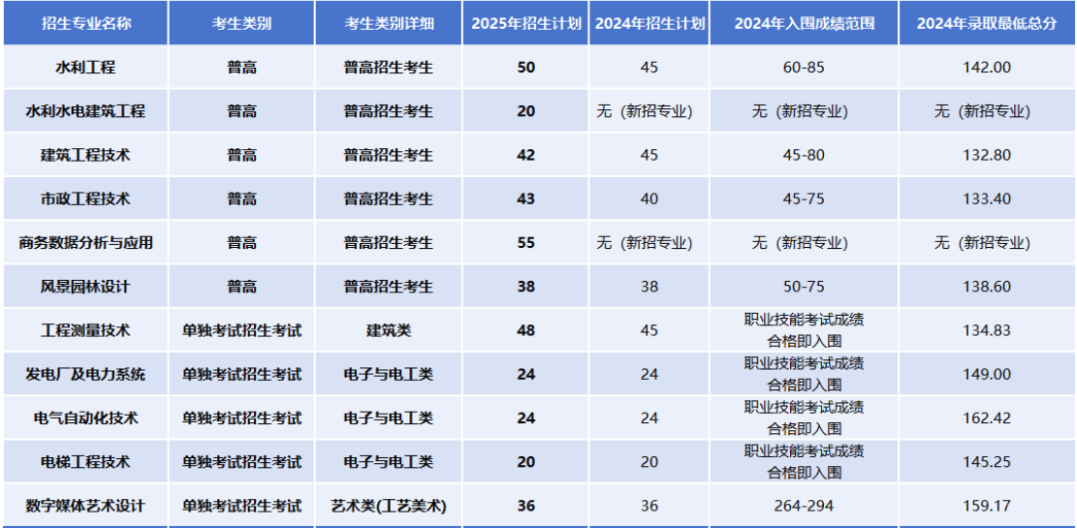 2025年学校在报考条件设置与上年保持一致,普高招生考生不设高中学考门槛,允许填报2个专业志愿,但只能参加一个专业的综合测评。单独考试招生考生职业技能操作考试合格即可允许填报1个专业志愿,且只能填报与单独考试招生报名一致的科类。