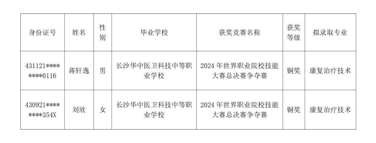 根据湖南省教育考试院《关于做好2025年普通高校招生职业技能赛事获奖学生推荐免试工作的通知》(湘教考通〔2025〕2号)文件规定,学校对申请免试录取考生相关证明材料进行了审核,并经招生工作领导小组研究通过。现将审核结果予以公示,公示3天,公示期2025年3月4日—2025年3月6日。公示期间,如对审核结果有异议可向相关部门反映。