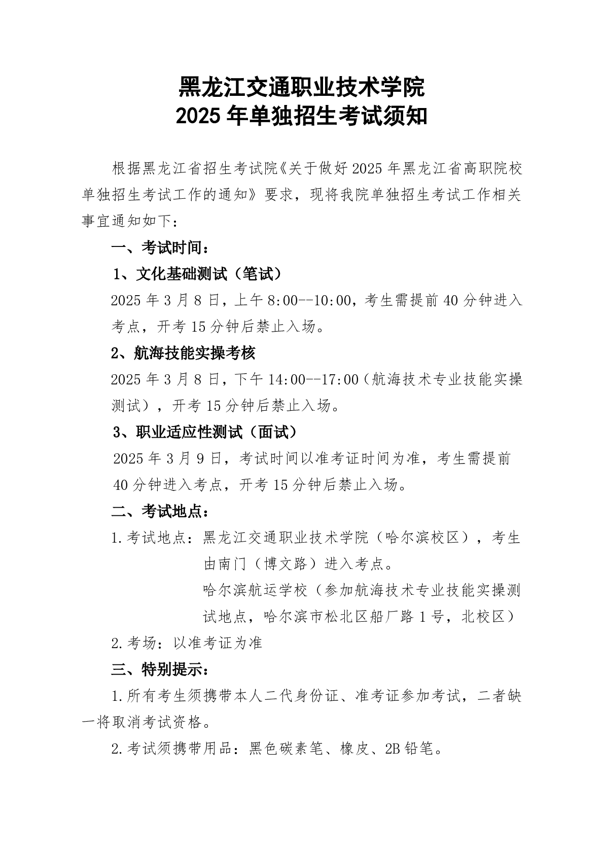 黑龙江交通职业技术学院2025年单独招生考试须知