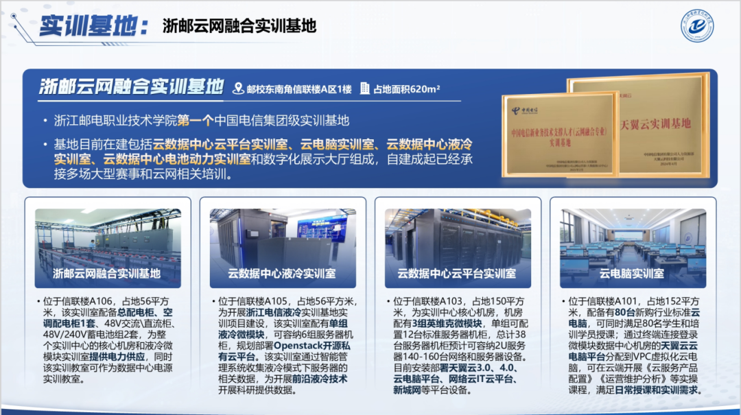 浙邮云网融合实训基地,自2023年10月立项2024年6月完工并投入使用,坐落邮校东南角信联楼A区1楼,占地面积620m²,学院第一个中国电信集团级实训基地,基地目前建成并投入使用包括云数据中心云平台实训室、云电脑实训室、云数据中心液冷实训室、云数据中心电池动力实训室和数字化展示大厅组成。