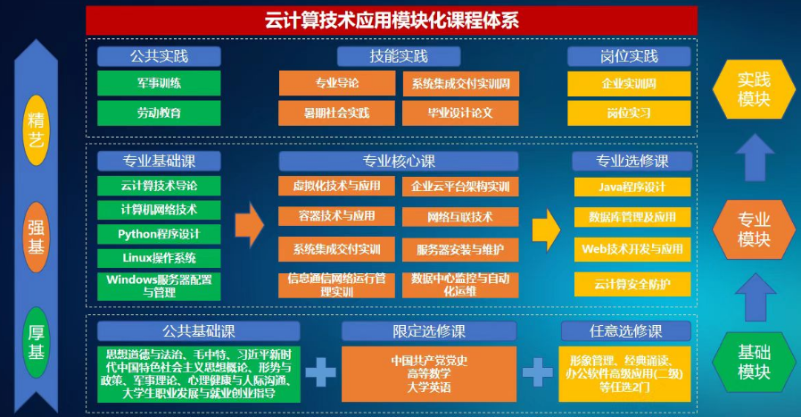 03 培养方向本专业培养思想政治坚定、德技并修、全面发展,适应云计算实际应用领域及地方区域产业发展的需要,具有一定的科学文化素质,良好的职业道德、工匠精神和创新精神;具备分析解决云计算技术领域实际问题和技术的应用能力,从事云计算系统规划设计、云计算平台搭建、云计算系统运维、云计算应用开发与服务等工作岗位的复合型技术技能人才。
