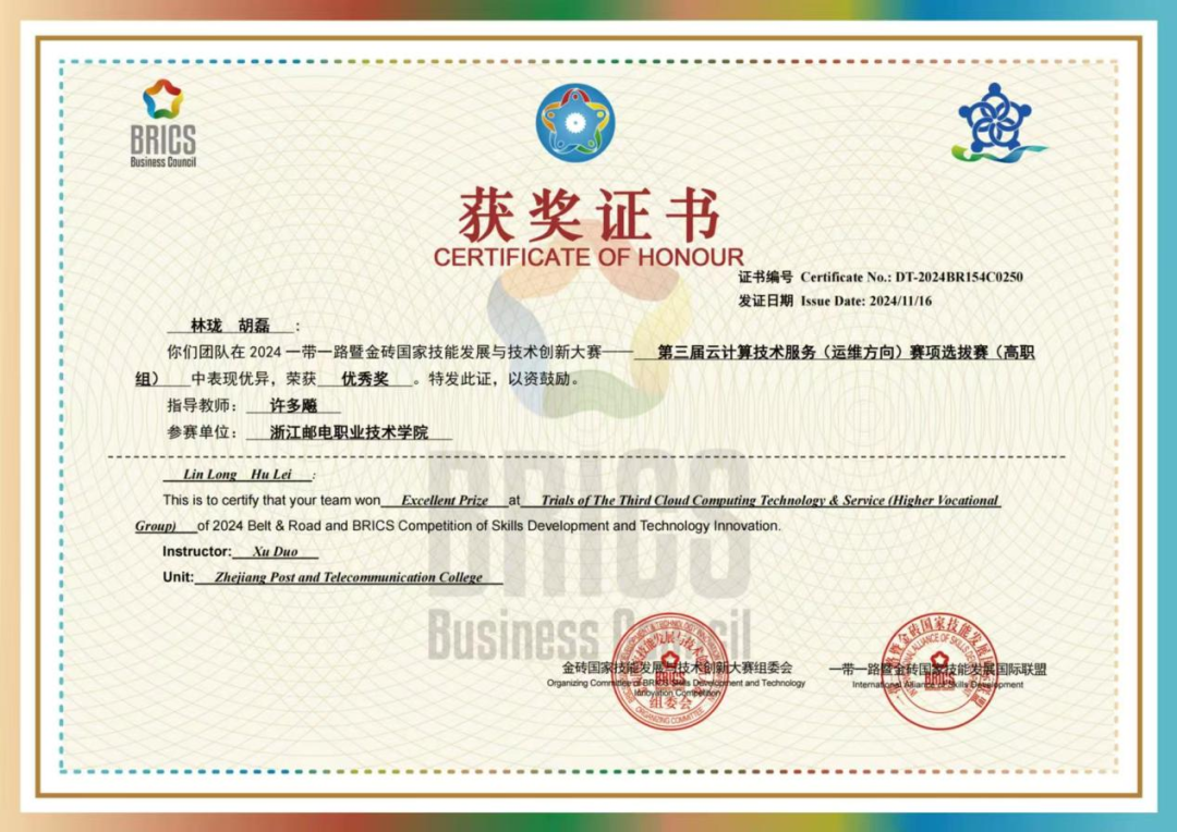 2024年一带一路金砖国家技能发展与技术创新大赛“云计算技术服务赛项”+优秀奖+林珑、胡磊
