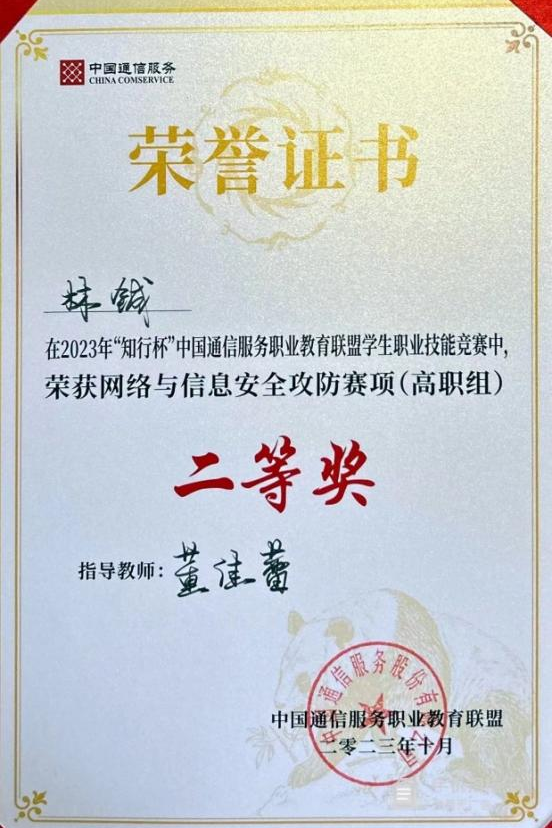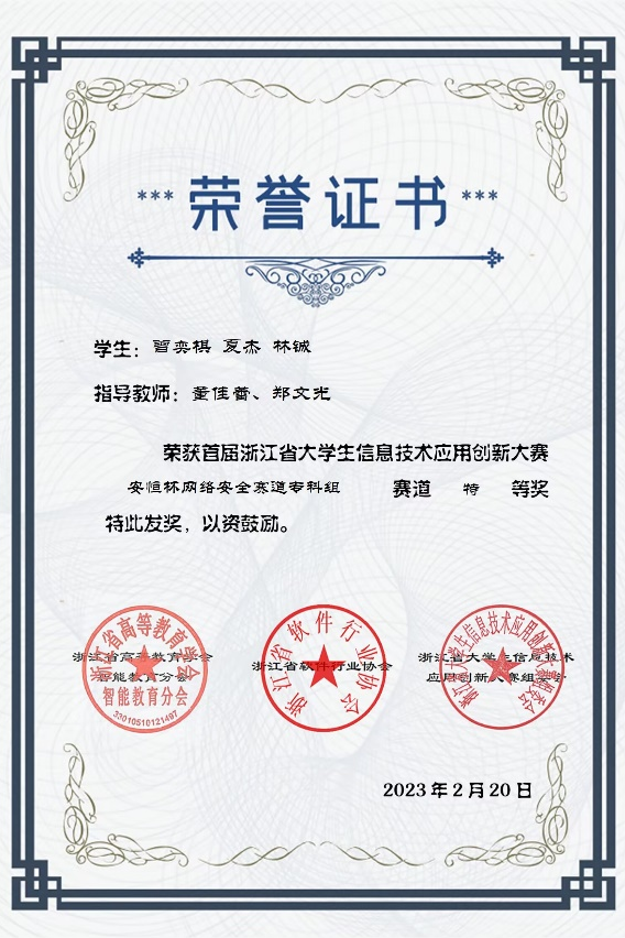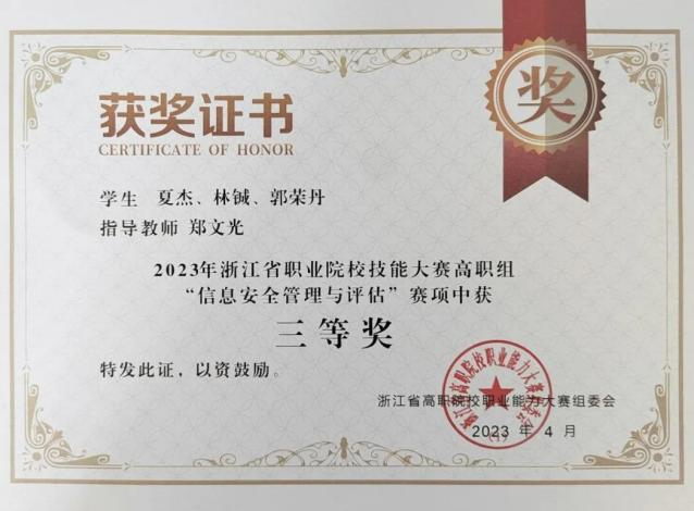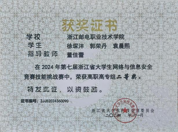 我校学子凭借扎实的网络安全技术实力与创新思维,获2024年第七届浙江省大学生网络与信息安全竞赛二等奖,2024年浙江省教育系统网络安全攻防演练第二名,2023年首届浙江省大学生信息技术应用创新大赛网络安全赛道专科组特等奖,2023年“知行杯”中国通服职业教育联盟“网络与信息安全攻防赛项”二等奖,绍兴市“护网2022”网络安全攻防演练高校组第一名。