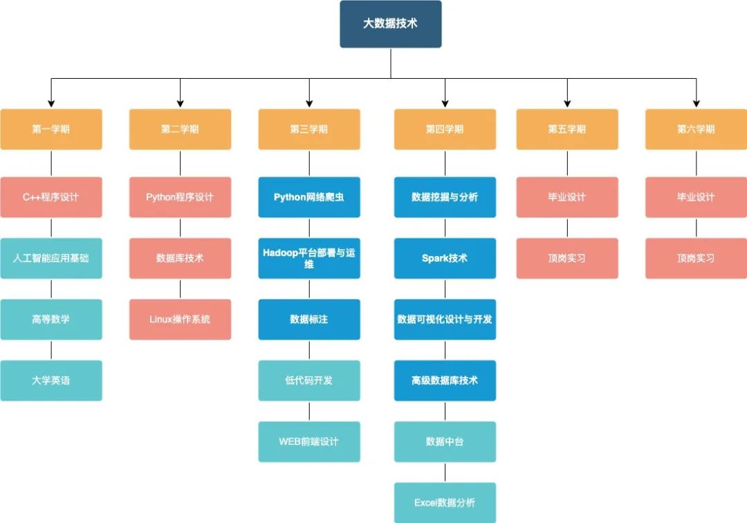 人工智能应用基础、Python程序设计、C++程序设计、数据库技术、高级数据库技术、Linux操作系统、Python网络爬虫、数据可视化设计与开发、WEB前端设计、低代码开发、数据挖掘与分析、Hadoop平台部署与运维、Spark技术、数据中台、数据标注等课程。