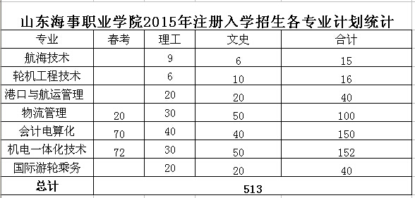 山东海事职业学院2015年注册入学招生各专业计划统计