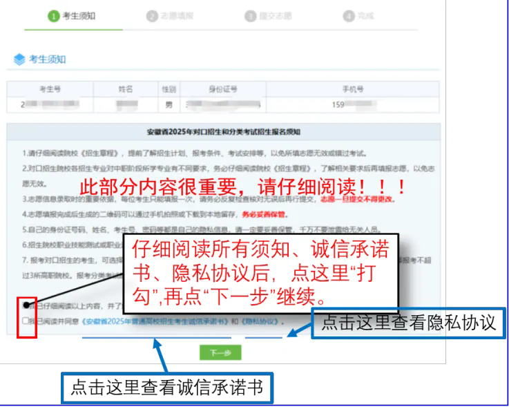 4.仔细阅读考生须知、《安徽省2025年普通高校招生考生诚信承诺书》《隐私协议》后,在小方框中“打勾”,点击“下一步”继续填报。一旦点击了“下一步”即表示你知晓并认可相关要求。
