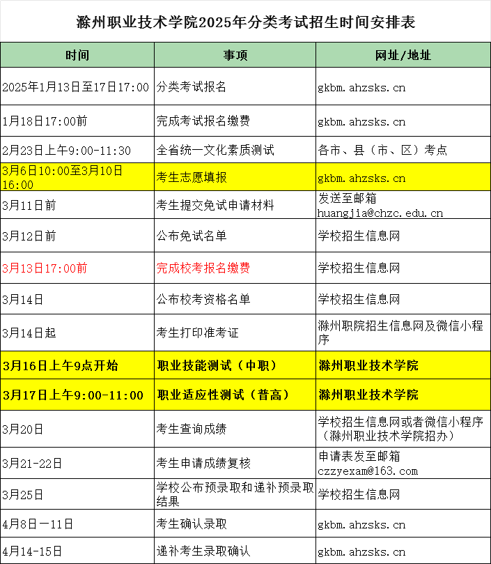 各位考生,滁州职业技术学院2025年分类考试时间安排表已出,请各位考生查收!