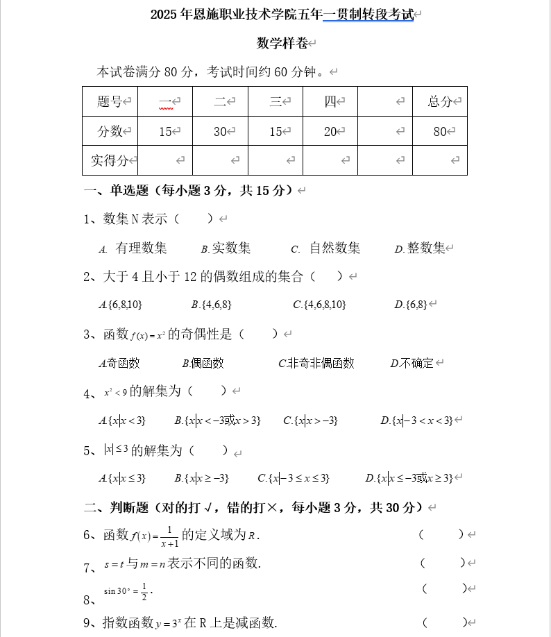 2025年恩施职业技术学院五年一贯制转段考试大纲