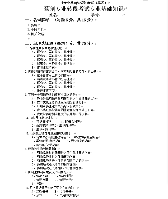 恩施职院2025年五年制转段考试大纲及样卷(药学专业)