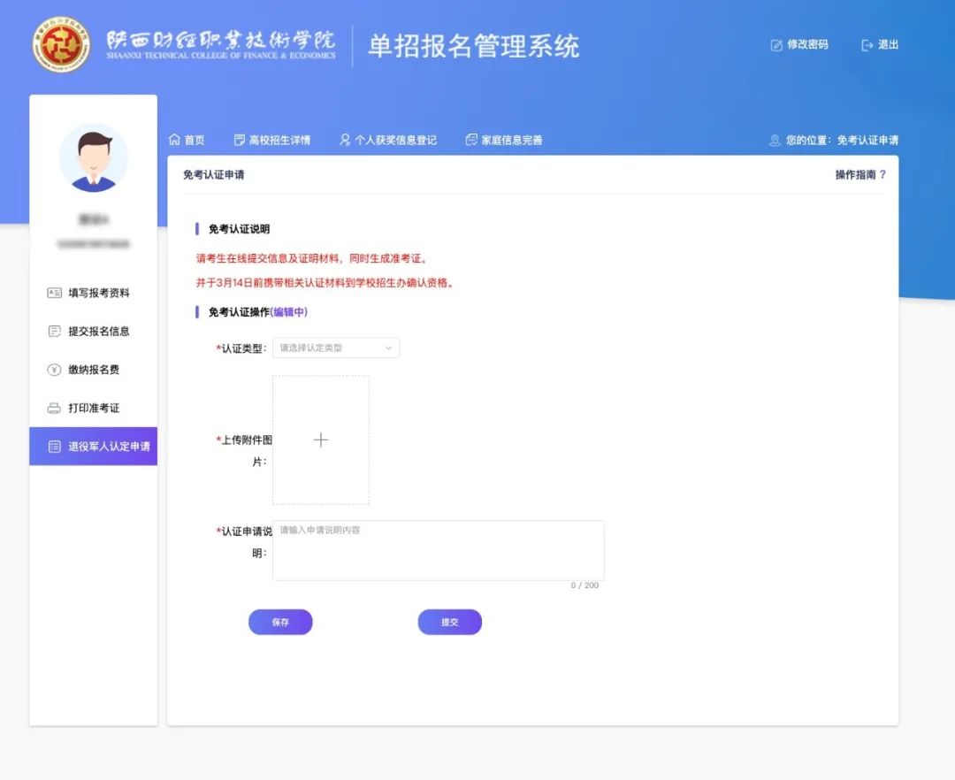 退役军人请点击左侧【退役军人认定申请】,在线提交信息及证明材料,同时生成准考证。并于3月14日前携带相关认证材料原件到学校招生办确认资格。