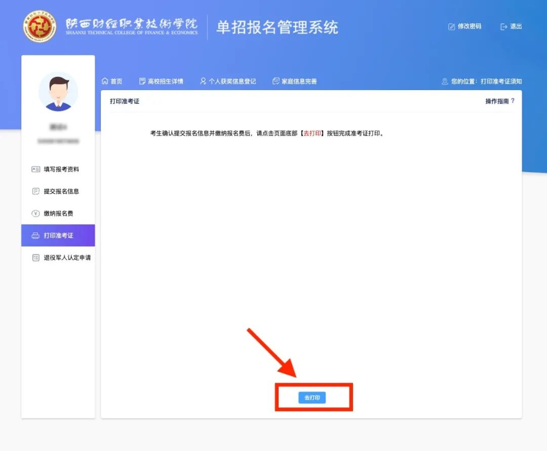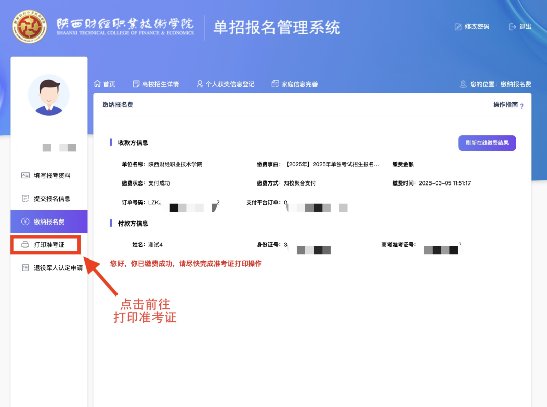 缴费成功后,点击前往打印准考证