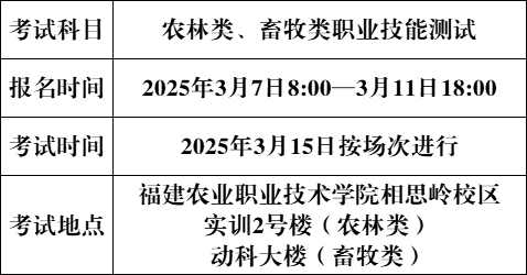 考生务必携带身份证、准考证,自带黑色水笔或签字笔。根据《农林类、畜牧类考生须知》的时间安排,到福建农业职业技术学院首山校区(福州市仓山区上三路190号)统一乘车至相思岭校区,请考生务必准时到达指定地点;考后再分批乘车返回首山校区。