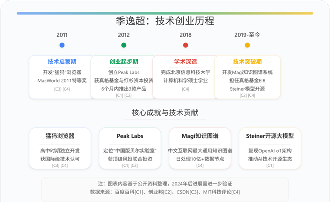 季逸超,男,1992年生,高中开发苹果应用程序,本科、硕士就读于北京信息科技大学计算机学院,大一推出“猛犸4”浏览器,并获得Macworld2011特等奖,20岁时获得真格基金与红杉资本的投资,曾是福布斯中国30岁以下精英榜的成员,创立了Peak Labs。