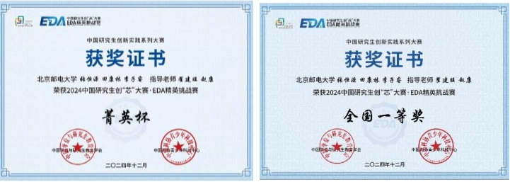 北京邮电大学EDA团队在中国研究生创“芯”大赛•EDA精英挑战赛中共斩获8项大奖,包括菁英杯(最高奖之一)1项、一等奖1项、三等奖1项、企业特别奖1项、学术进取奖2项、优秀指导教师奖2项。