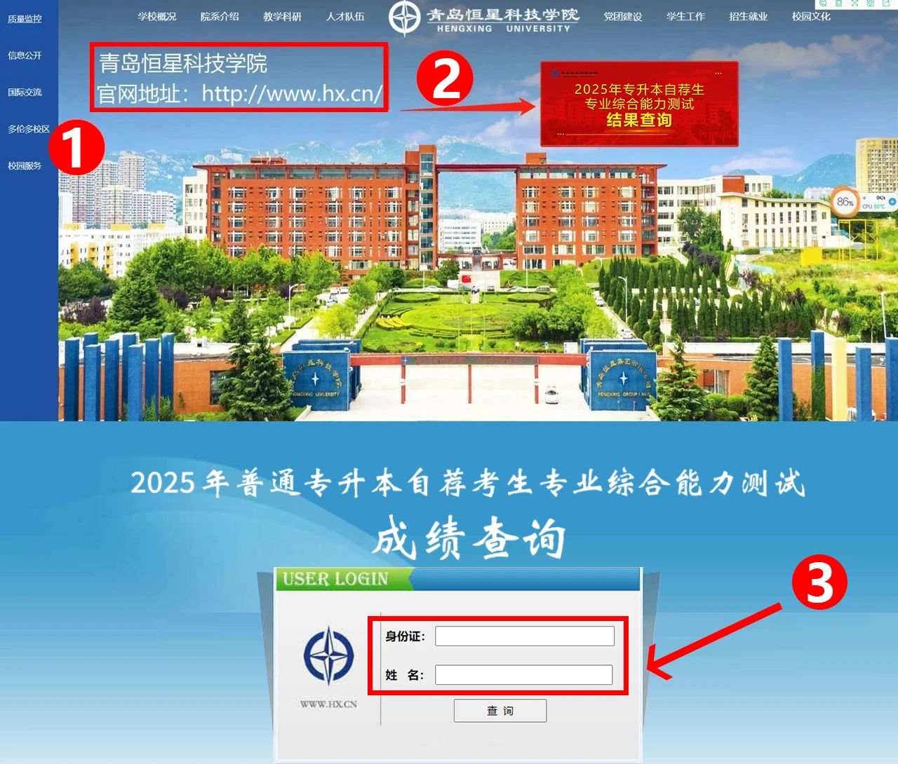 登录青岛恒星科技学院官网(http://www.hx.cn/)--点击专升本结果查询--输入个人信息--查询