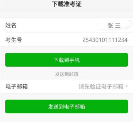 点击“打印准考证”按钮可以下载准考证,下载提供二种方式:下载到手机、发送到电子邮箱。