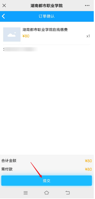 请再次核对缴费项目和金额,若有误请点返回修改,若无误请提交订单确认支付(可选择微信或支付宝支付)。