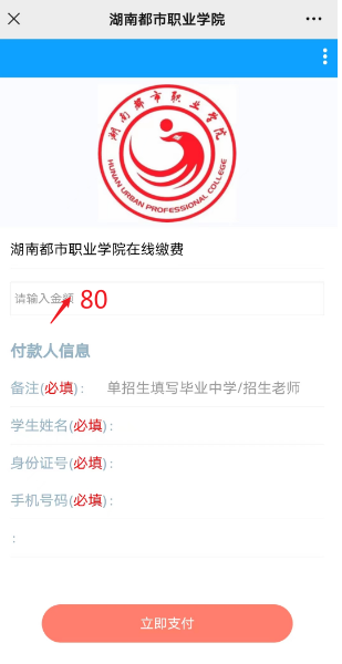 点击跳转到非税缴费,输入缴费金额80、备注、学生姓名、身份证号、手机号码,请仔细检查填写是否正确,若无误请点击“立即支付”进入支付页面。