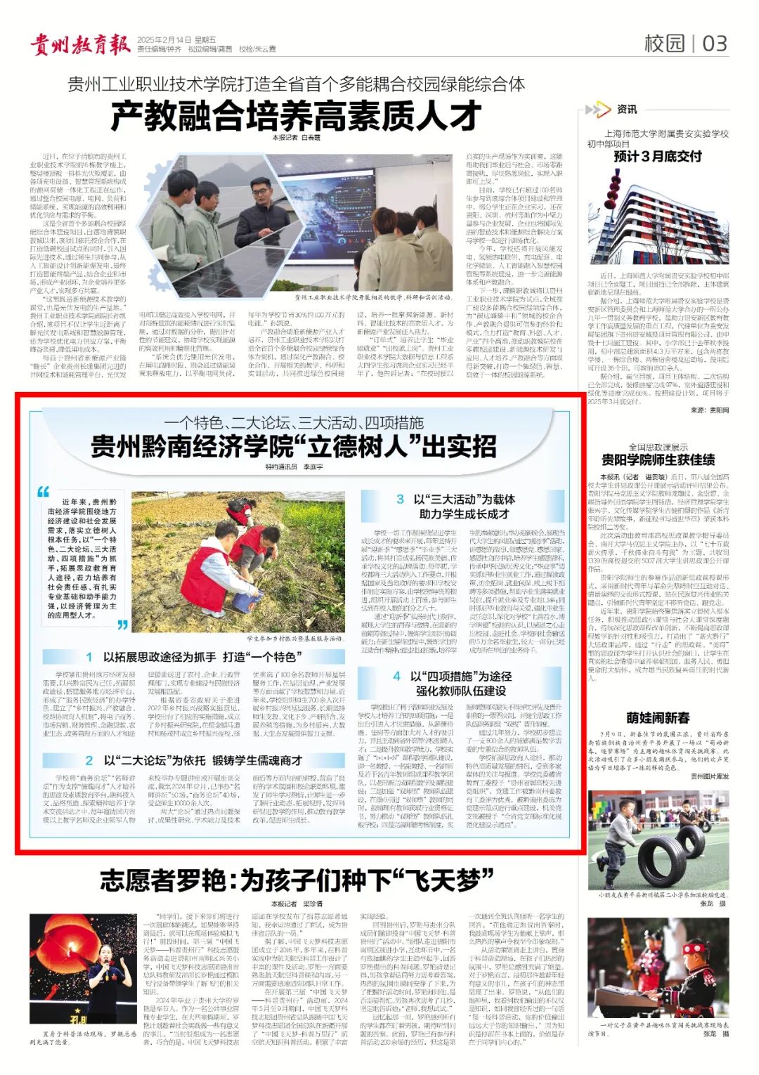 近年来,贵州黔南经济学院围绕地方经济建设和社会发展需求,落实立德树人根本任务,以“一个特色、二大论坛、三大活动、四项措施”为抓手,拓展思政教育育人途径,着力培养有社会责任感、有扎实专业基础和动手能力强,以经济管理为主的应用型人才。